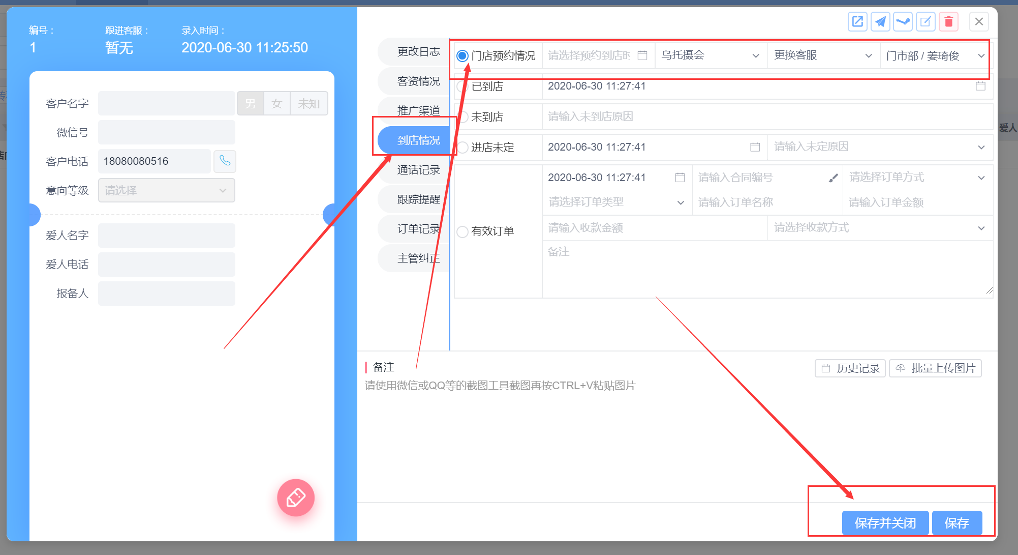 邀约到店客户操作:选好到店时间,接待门市后点保存